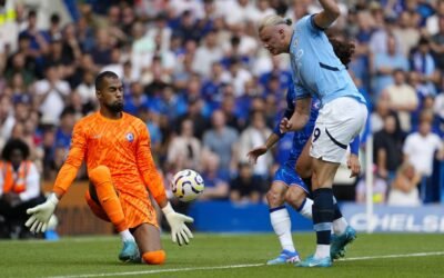 Erling Haaland scored his 91st goal in his 100th appearance for Manchester City on Sunday as the champion kicked off its Premier League title defence with a lively 2-0 away win over Chelsea. The big Norwegian, fed by Bernardo Silva, forced his way between Marc Cucurella and Wesley Fofana and finished neatly past Robert Sanchez…