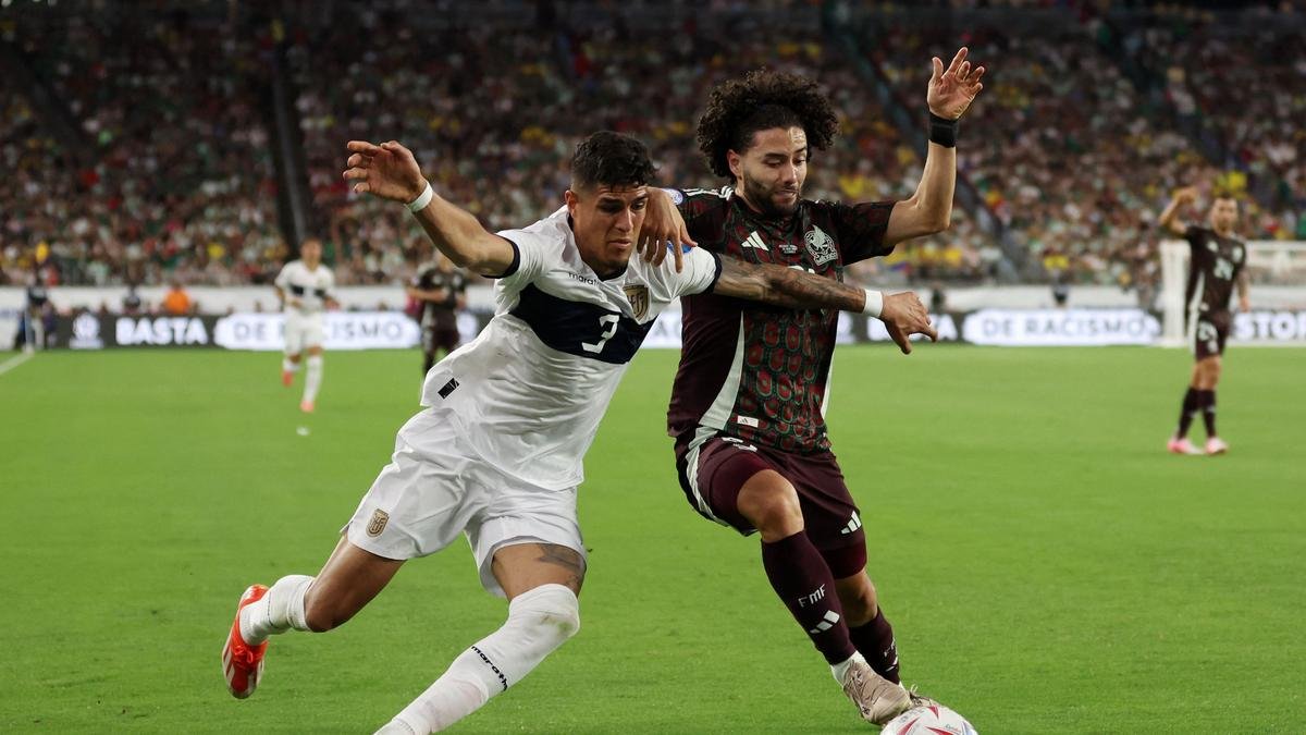 Cesar Huerta of Mexico controls the ball against Piero Hincapie of Ecuador in the second half during the CONMEBOL Copa America 2024 Group D match between Mexico and Ecuador.