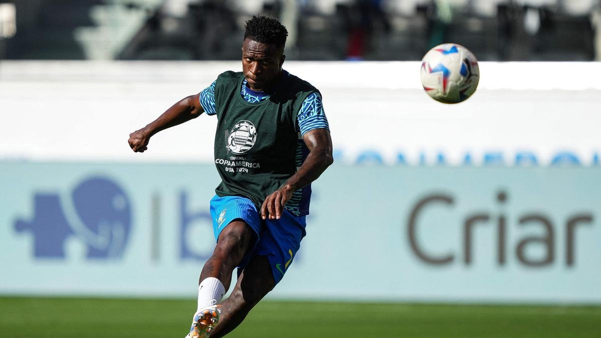 Vinicius Junior of Brazil warms up prior to the CONMEBOL Copa America 2024 Group D match between Brazil and Colombia.