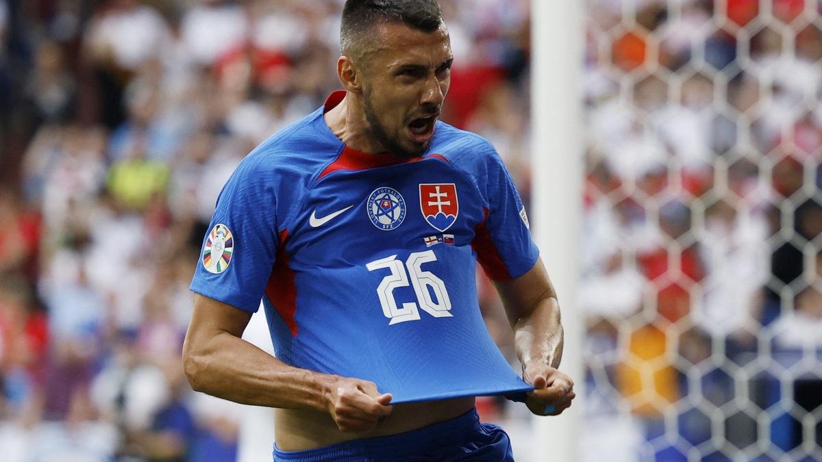 Slovakia’s Ivan Schranz celebrates scoring their first goal REUTERS/John Sibley