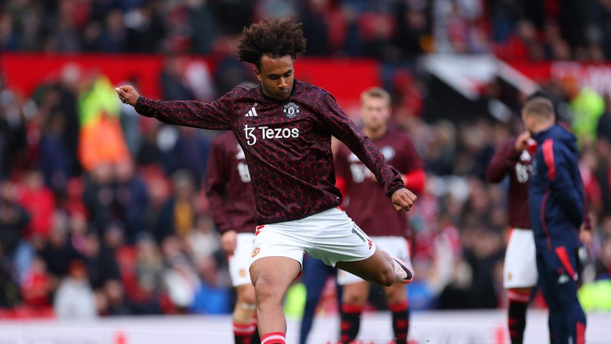 Joshua Zirkzee of Manchester United warms up prior to the Premier League match between Manchester United FC and Tottenham Hotspur FC at Old Trafford on September 29, 2024 in Manchester, England.