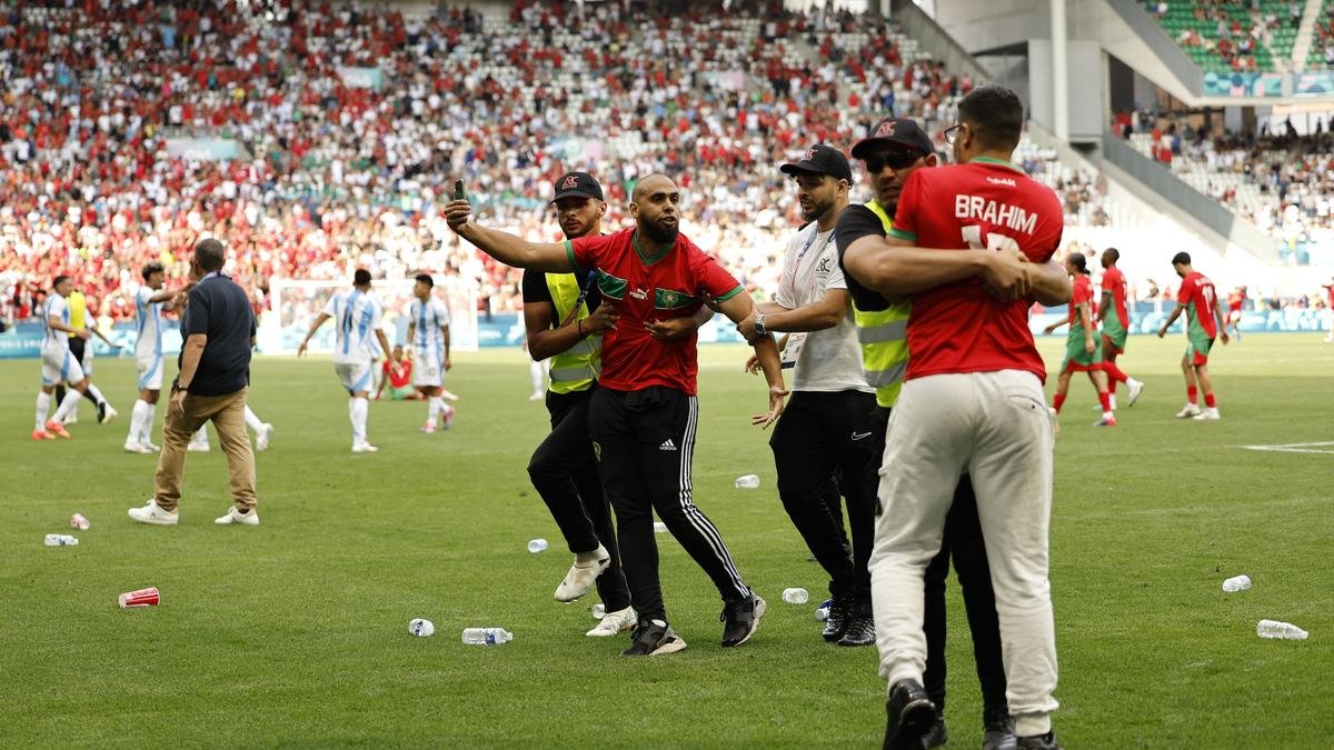 “The football match between Argentina and Morocco at the Saint-Etienne Stadium was suspended due to a pitch invasion by a small number of spectators,” Games organisers said.