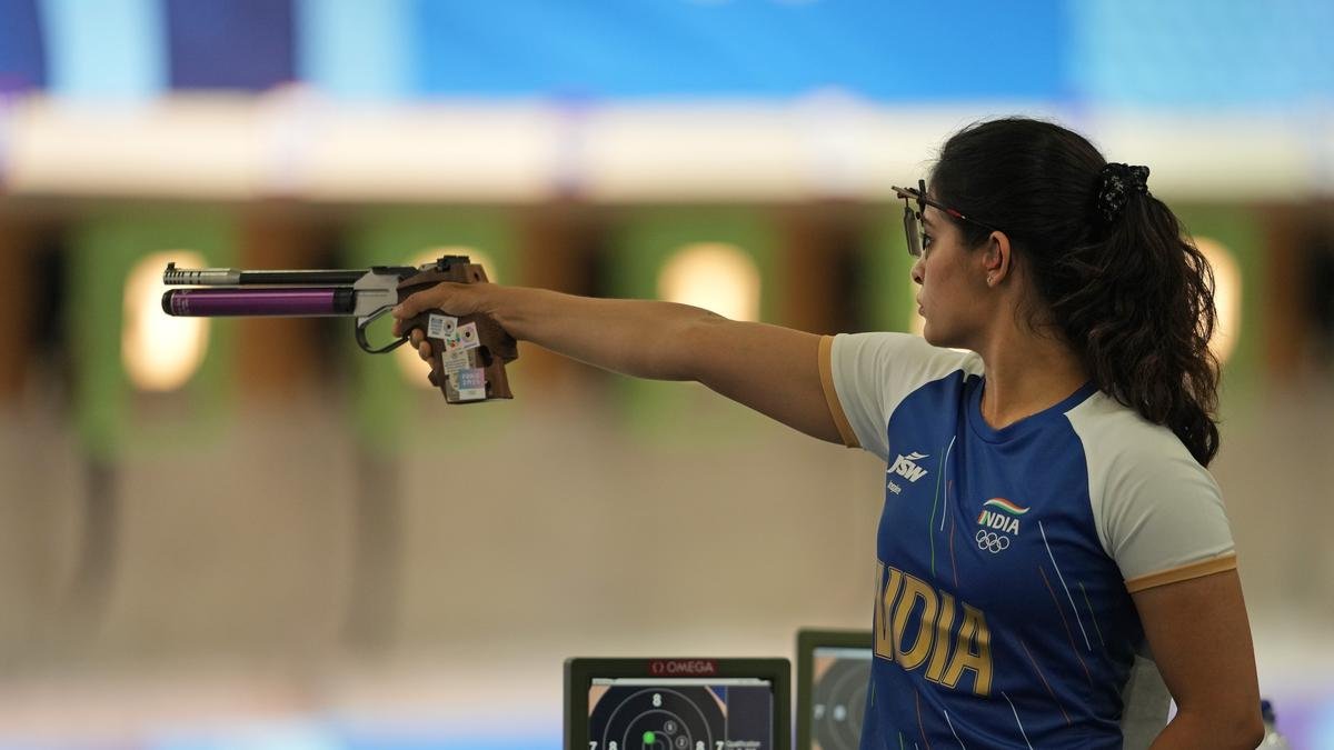 India’s Manu Bhaker takes aim during the 10m Air Pistol Women Pre-event Training at the 2024 Summer Olympics, Friday, July 26, 2024, in Chateauroux, France. AP/PTI(AP07_26_2024_000266B)