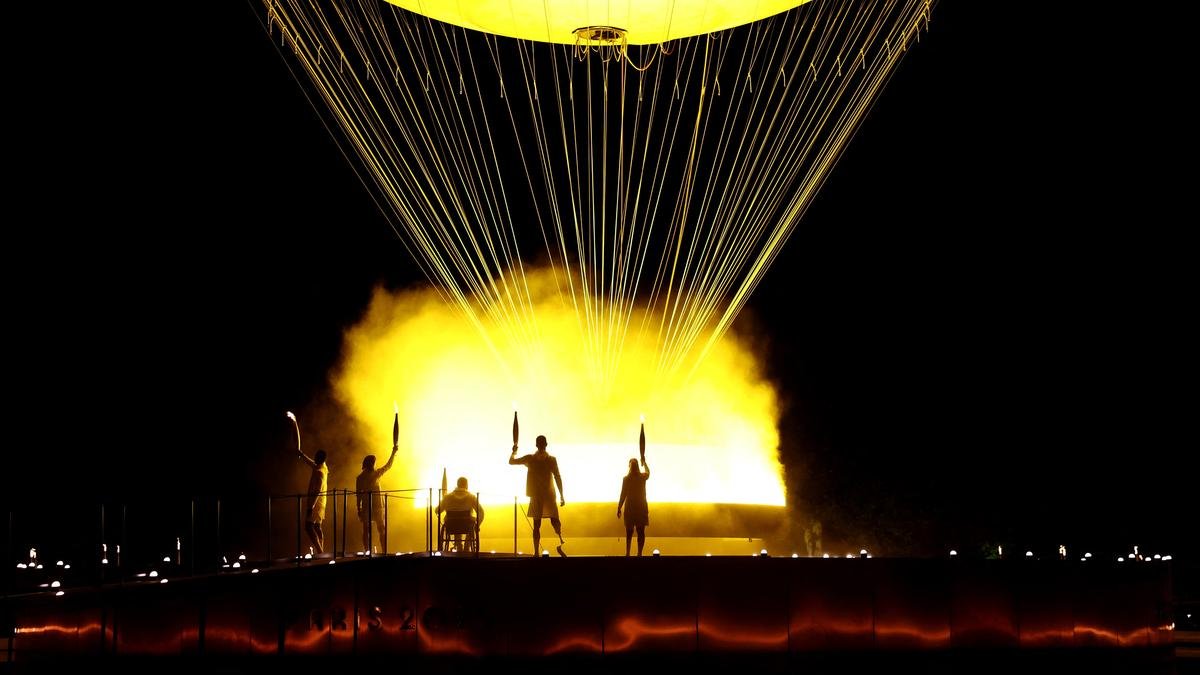 Paris 2024 Paralympics: Charles-Antoine Kouakou, Fabien Lamirault, Elodie Lorandi, Alexis Hanquinquant and Nantenin Keïta light the cauldron during the Opening Ceremony at Jardin des Tuileries on Wednesday.