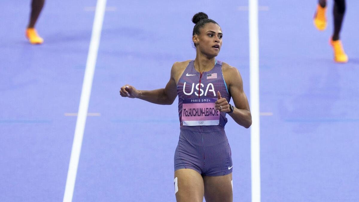 Sydney McLaughlin-Levrone, of the United States, crosses the finish line in the women’s 400 meters hurdles semifinal.