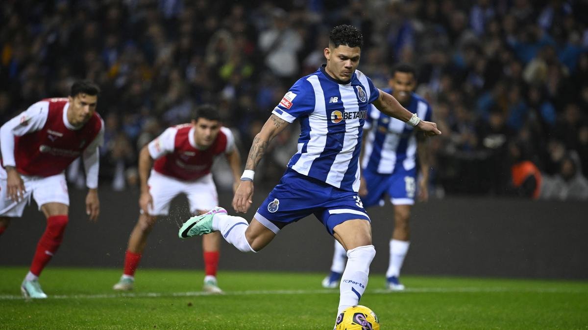 FILE PHOTO: FC Porto’s Brazilian forward Evanilson Barbosa prepares to score his team’s second goal from the penalty spot during the Portuguese League football match between FC Porto and SC Braga.