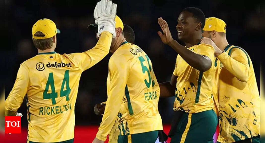 NEW DELHI: Marco Jansen and Corbin Bosch shared four wickets as South Africa claimed a 14-run victory over England under the Duckworth-Lewis-Stern (DLS) method in a rain-shortened first T20I at Cardiff on Wednesday.Persistent showers at Sophia Gardens reduced what should have been a 40-over contest to just 12.5 overs in total. England were left chasing a stiff revised target of 69 in five overs but faltered to 54 for 5, unable to keep pace with a daunting run rate of nearly 14 an over against South Africa’s disciplined attack.Jansen (2 for 18) and Bosch (2 for 20) did most of the damage, while Jos Buttler (25) was the only England batter to reach 20.Earlier, South Africa were put in to bat after England captain Harry Brook won the toss. The visitors raced to 97 for 5 in 7.5 overs thanks to a series of quickfire contributions. Skipper Aiden Markram top-scored with 28 off 14 balls, including two fours and two sixes, though he enjoyed a slice of luck when Phil Salt dropped him in the deep. Donovan Ferreira was named player of the match for his unbeaten 25 off just 11 balls, featuring three sixes, while Dewald Brevis chipped in with 23.England opted to rest Jofra Archer, who had starred with four wickets in the third ODI at Southampton, with Luke Wood taking his place. Wood impressed in the damp conditions, removing opener Ryan Rickelton for a golden duck en route to figures of 2 for 22.Reflecting on the chaotic contest, Markram said at the presentation: “It feels like madness, but you can think about things. It was swinging with the new ball, but you need one or two guys to make a cameo and you can reach a good score.”England’s chase unraveled quickly. Salt holed out to Kagiso Rabada off the very first ball, while captain Brook followed for a duck. Jacob Bethell, fresh from his maiden professional century at Southampton, made just seven before skying Jansen to cover.Buttler briefly kept the hosts alive before he too fell, edging Jansen behind. That left England needing 26 from the final over, but Bosch struck with his first ball to remove Tom Banton, ending any hopes of a late charge.South Africa now lead the three-match series 1-0, with the second T20I scheduled for Friday at Old Trafford.
