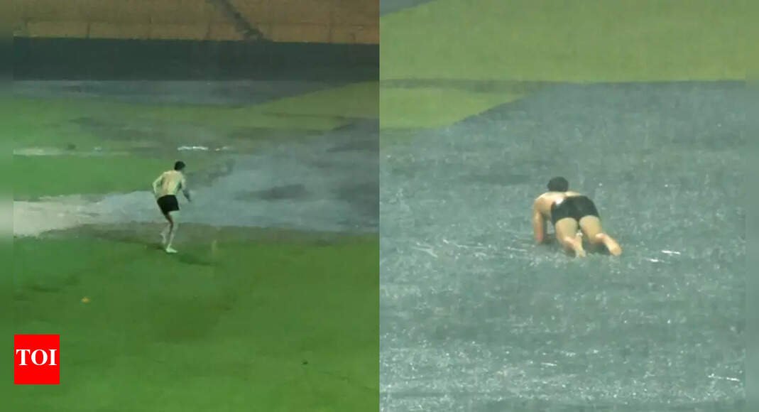 NEW DELHI: The IPL 2025 returns on Saturday with a blockbuster showdown between Royal Challengers Bengaluru and Kolkata Knight Riders at the M. Chinnaswamy Stadium. But before the cricketing action kicks off, RCB’s all-rounder Tim David grabbed the spotlight — and not for his batting.With heavy rain drenching the stadium, most players made a quick dash to shelter. Not Tim David. Clad in shorts and undeterred by the downpour, the Australian cricketer dove onto a water-logged cover, turning it into his own personal splash pool. His impromptu rain-swim had everyone in splits, and when he returned to the dressing room soaked and smiling, his teammates greeted him with a round of applause.David has been in top form this season. In 11 matches, he has racked up 186 runs, including a blistering unbeaten 50, averaging a staggering 93 and striking at 194 — making him one of RCB’s most dangerous finishers in IPL 2025.Gujarat Titans and Royal Challengers Bengaluru lead the table with 16 points each from 11 matches. Gujarat, however, sit atop thanks to their superior Net Run Rate (NRR) of +0.793, compared to RCB’s +0.482.Punjab Kings are right on their heels with 15 points, including one no-result, and an NRR of +0.376. Mumbai Indians, with 14 points from 12 matches and the best NRR so far at +1.156, also remain strong contenders.