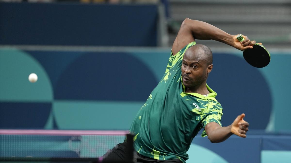Nigeria’s Quadri Aruna plays against Romania’s Eduard Ionescu during a men’s singles round of 64 table tennis game at the 2024 Paris Olympics.